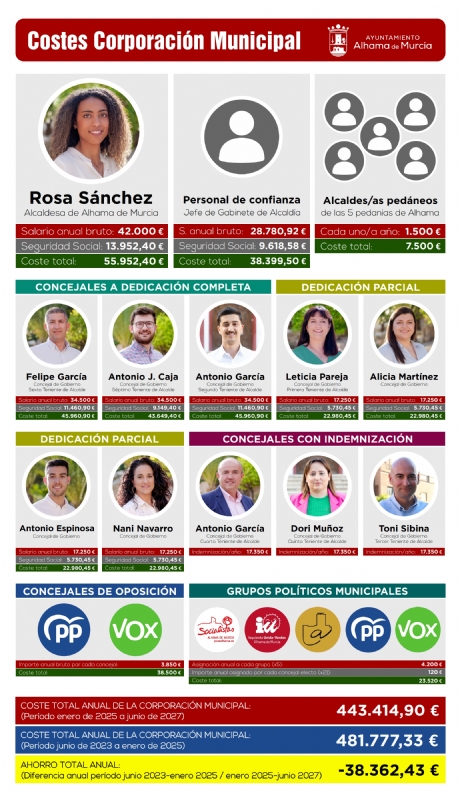 El Ayuntamiento de Alhama hace públicos los gastos de la Corporación municipal para el período 2025-2027, tras la aprobación el pasado 11 de enero de la propuesta de Alcaldía sobre retribuciones de los concejales.