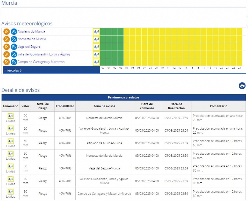 El Ayuntamiento informa que, según la predicción de la AEMET, la Región de Murcia estará afectada por lluvias intensas mañana, miércoles 5 de marzo. La AEMET ha emitido avisos por acumulación de precipitaciones durante el día, con las siguientes características: