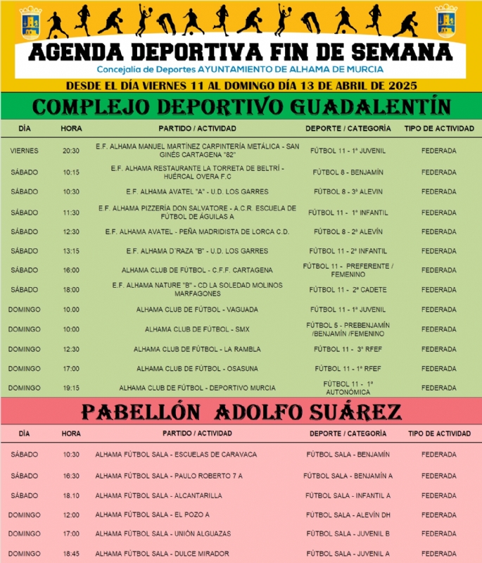 La concejalía de Deportes informa de la actualización de la Agenda Deportiva para el fin de semana del 11 al 13 de abril.