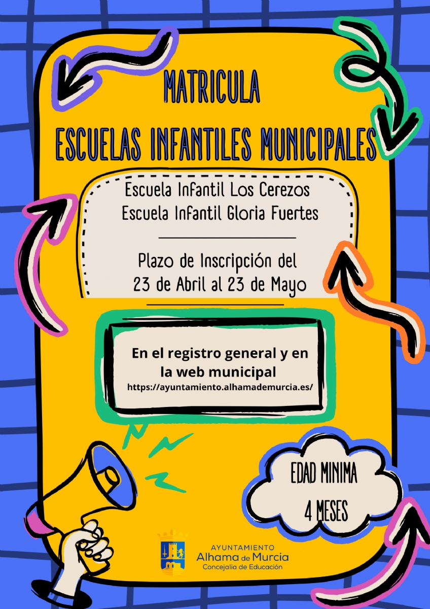 La concejalía de Educación del Ayuntamiento de Alhama Murcia informa de la apertura del plazo de matrícula para las escuelas infantiles Gloria Fuertes y Los Cerezos, que abarcará desde hoy 23 de abril hasta el 23 de mayo.