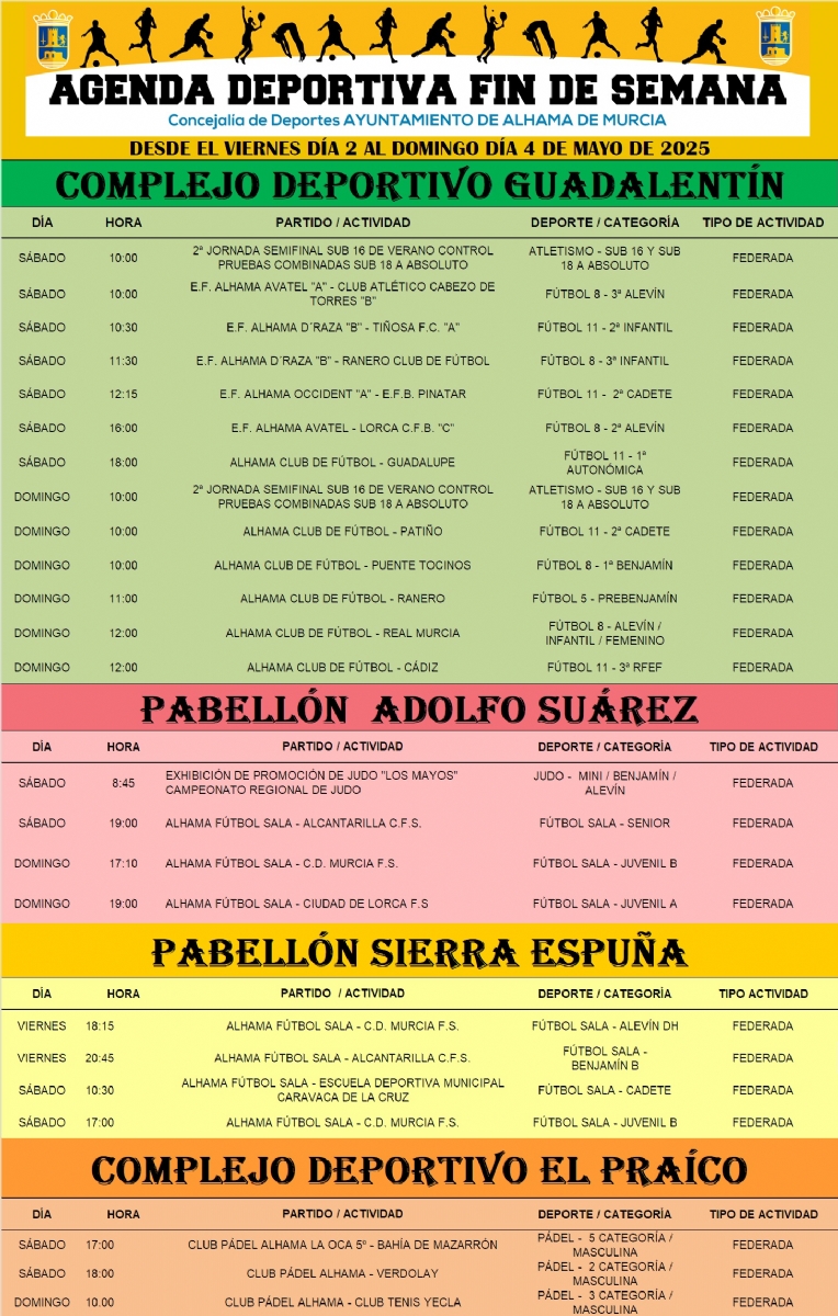 La concejalía de Deportes informa de la actualización de la Agenda Deportiva para el fin de semana del 2 al 4 de mayo.
