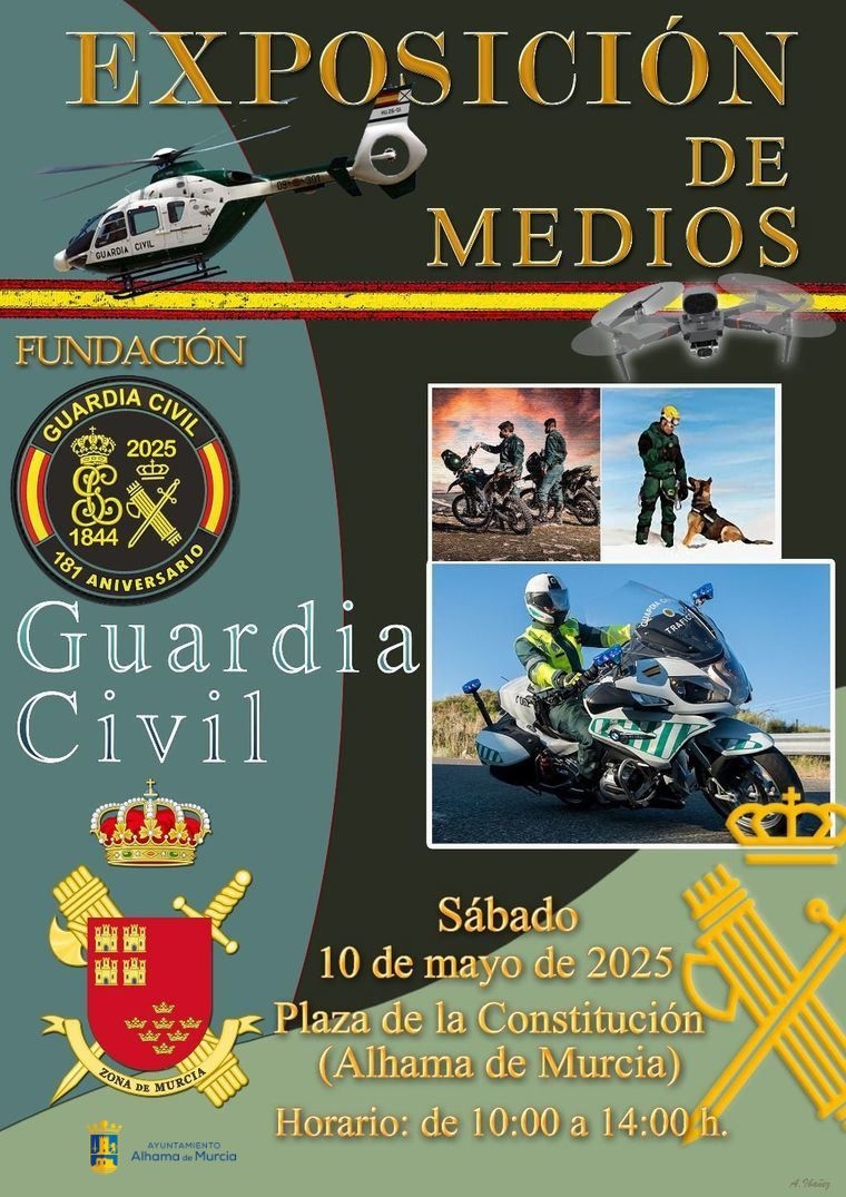 La Guardia Civil de la Región de Murcia realizará el 10 de mayo de 10:00 a 14:00h , en la plaza de la Constitución del municipio, una exhibición de recursos técnicos y humanos, que se encuentra enmarcada en los actos oficiales de la celebración del 181º aniversario de la fundación de la Benemérita.
