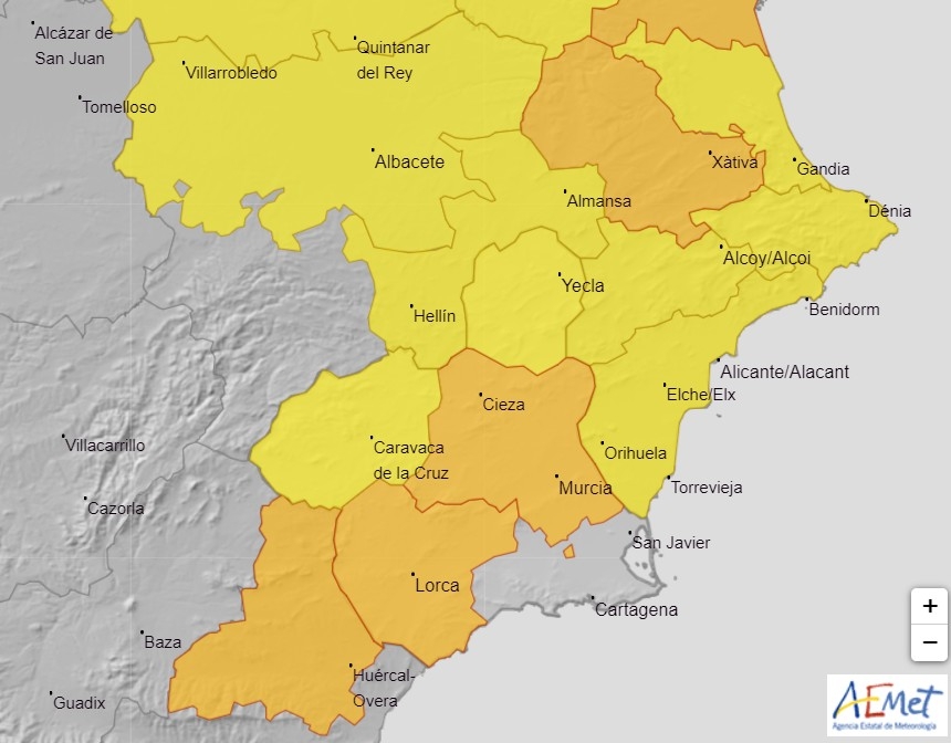 La Agencia Estatal de Meteorología (AEMET) ha elevado a nivel naranja la alerta por lluvias en la Región de Murcia para este jueves 8 de mayo. Se prevén precipitaciones intensas que podrían alcanzar los 15 mm en una hora, afectando principalmente a las comarcas del Valle del GuadalentínLorcaÁguilas, el Campo de Cartagena y Mazarrón.  También la posibilidad de granizo, la alerta estará vigente hasta las 22:00 horas.