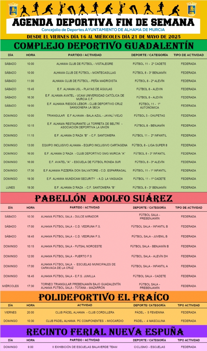 La concejalía de Deportes informa de la actualización de la Agenda Deportiva para el fin de semana del 16 al 21 de mayo.