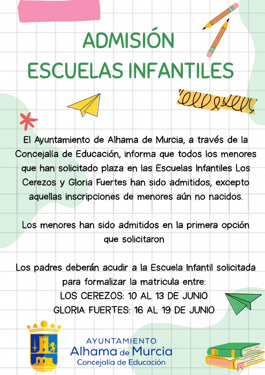 El Consitorio informa de que todos los menores que han solicitado plaza para el curso 2025-2026 en las Escuelas Infantiles Municipales Los Cerezos y Gloria Fuertes han sido admitidos. La única excepción corresponde a las solicitudes presentadas para nonatos (menores que aún no han nacido), que no pueden ser aceptadas en esta fase del proceso.