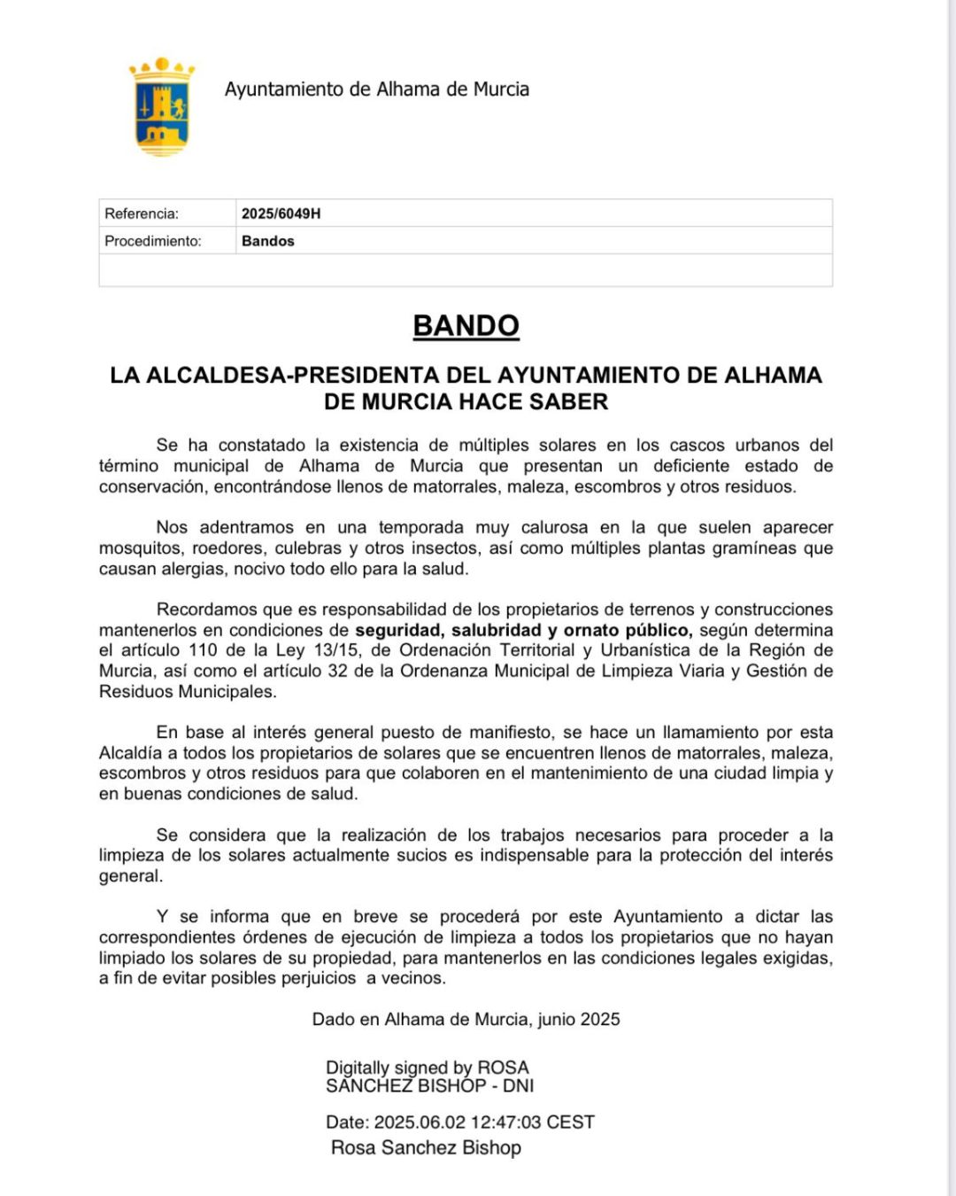 El Ayuntamiento de Alhama de Murcia, a través de un Bando de Alcaldía, recuerda a la ciudadanía la obligación de conservar en buen estado de limpieza los solares urbanos, una actuación especialmente importante con la llegada del verano, cuando aumentan los riesgos asociados a la acumulación de maleza, residuos y escombros.