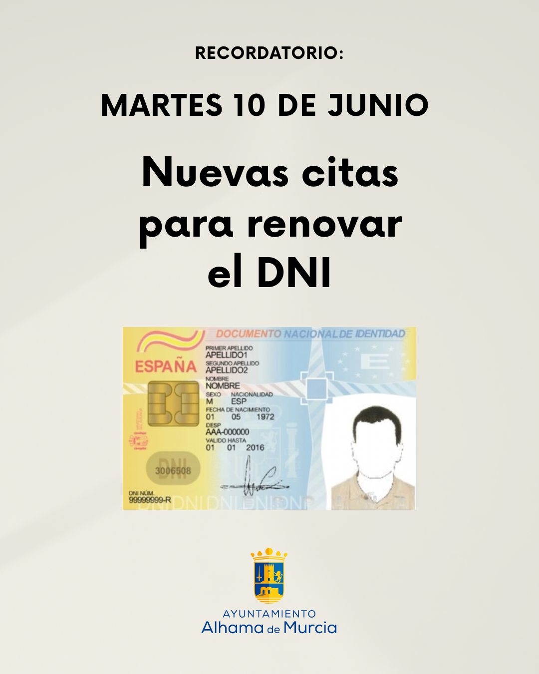 El Ayuntamiento de Alhama informa que se ha programado una nueva fecha para solicitar citas de expedición o renovación del Documento Nacional de Identidad (DNI).