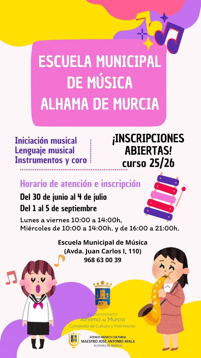 Para más información, las personas interesadas pueden acudir directamente a la Escuela Municipal de Música, o contactar telefónicamente a través del 968 63 00 39 (Escuela Municipal de Música) o del 968 63 00 00 (Ayuntamiento de Alhama de Murcia).