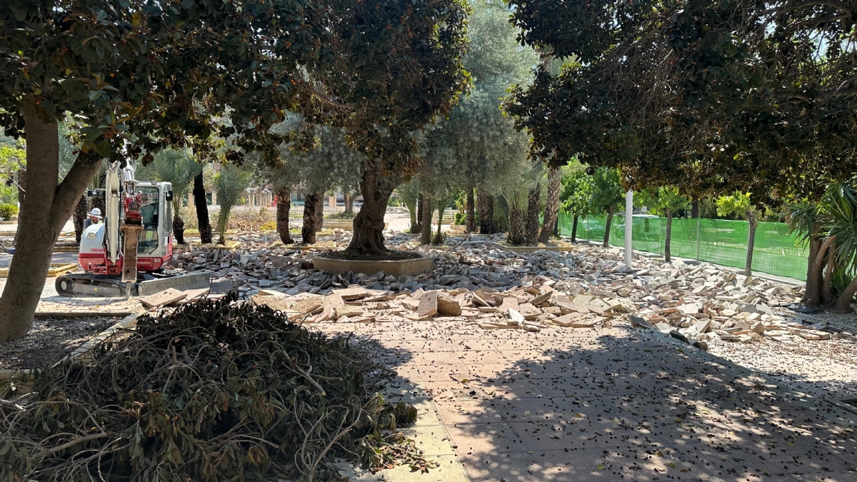 En las últimas semanas, se ha procedido a la retirada de las luminarias y bancos existentes, con la firme intención de reutilizarlos, demostrando el compromiso municipal con la economía circular y la preservación del patrimonio urbano. Asimismo, se ha realizado una poda controlada de los ficus, junto al desmontaje de la pérgola, las barandillas y otros elementos del mobiliario urbano, siempre bajo estrictos criterios técnicos.