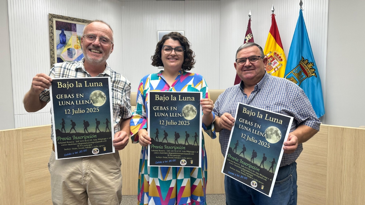 La concejala de Pedanías, Alicia Martínez, ha presentado una nueva edición de la actividad senderista “Gebas en luna llena”, acompañada por Diego Crespo, presidente de la Asociación de Vecinos de Gebas, y Paul Stratford, alcalde pedáneo.