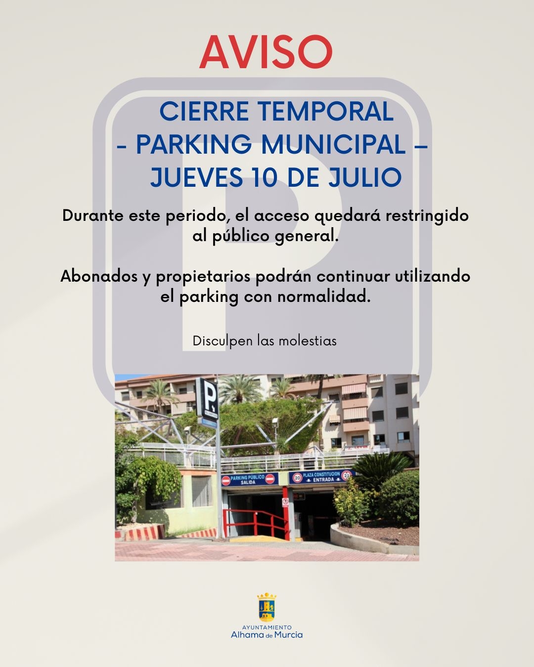 El Ayuntamiento informa que el próximo jueves 10 de julio permanecerá cerrado el aparcamiento municipal situado en la Plaza de la Constitución debido al inicio de las obras de remodelación en dicho espacio.