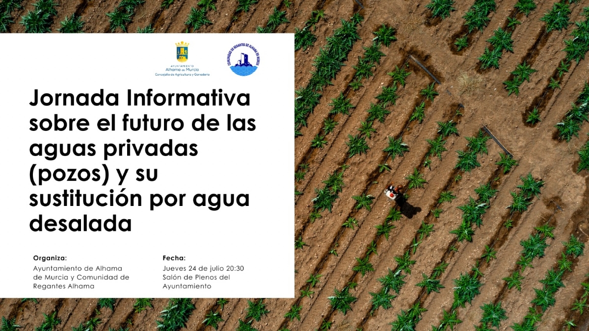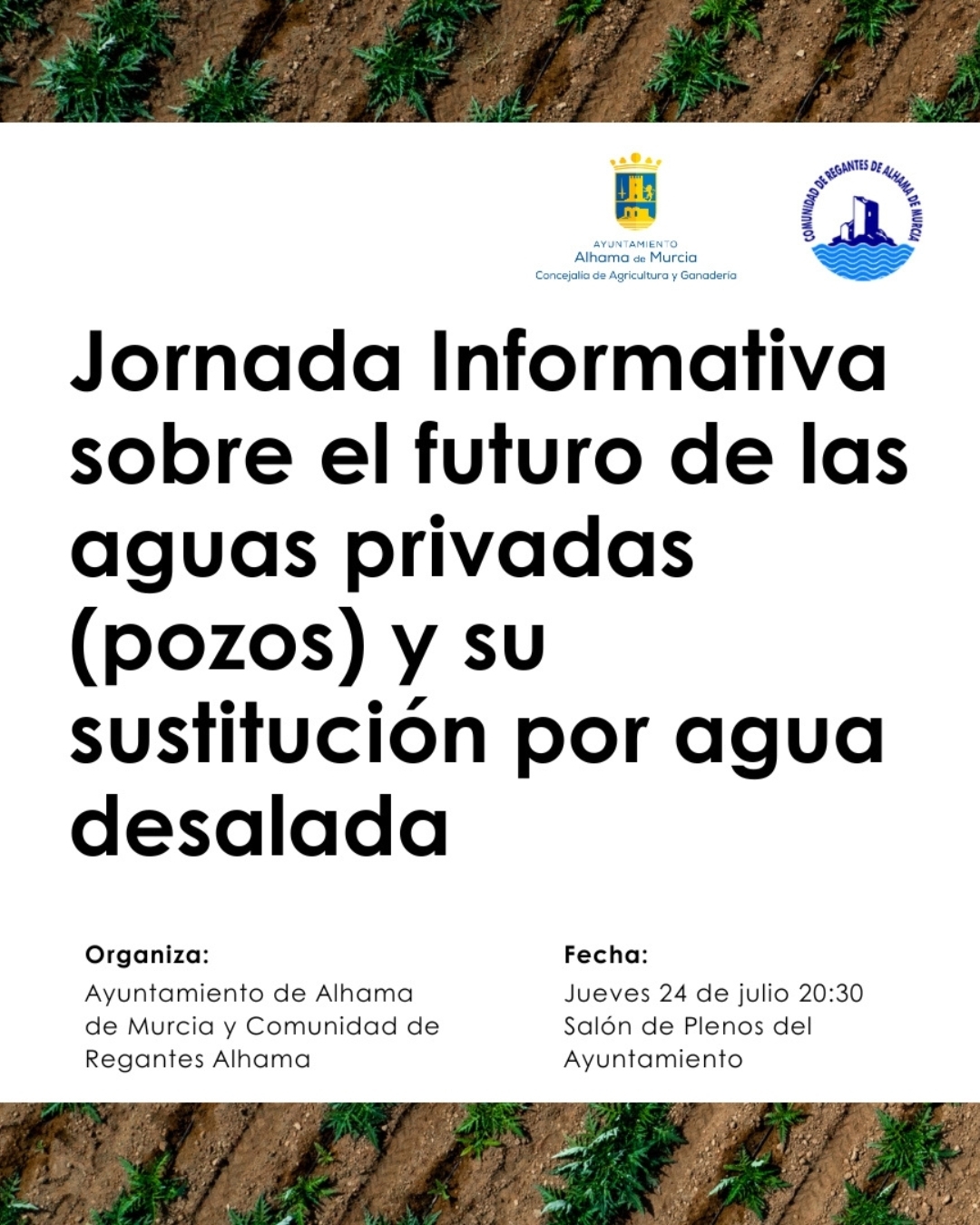 El Ayuntamiento, a través de la concejalía de Agricultura y Ganadería, y la Comunidad de Regantes de Alhama, organizan una jornada informativa dirigida a comuneros y propietarios de derechos de aguas de pozos dentro del perímetro de riego de la comunidad.