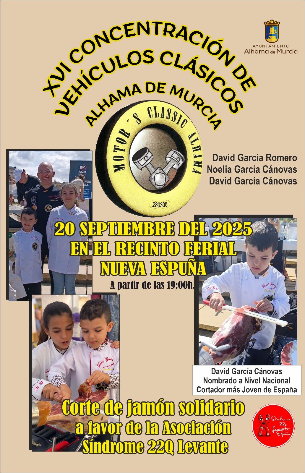 El evento, ya consolidado como una cita imprescindible del calendario local, comenzará a las 16:30 horas y reunirá a decenas de vehículos clásicos, tanto coches como motocicletas, que podrán ser admirados en un ambiente familiar, festivo y solidario. Como novedad destacada de esta edición, la jornada incluirá un corte de jamón solidario, protagonizado por David García Cánovas, recientemente nombrado el cortador de jamón más joven de España, acompañado de David García Romero y Noelia García Cánovas. El acto dará comienzo a las 19:00 horas en el mismo recinto.