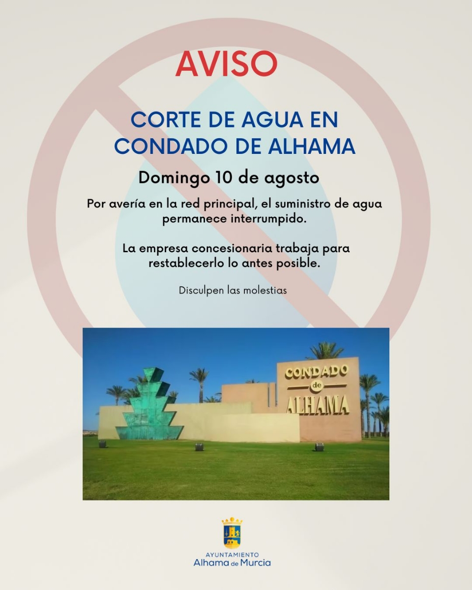 El Consistorio informa a la ciudadanía que, debido a una avería en la red principal de abastecimiento de agua, el suministro permanece suspendido en la urbanización Condado de Alhama.