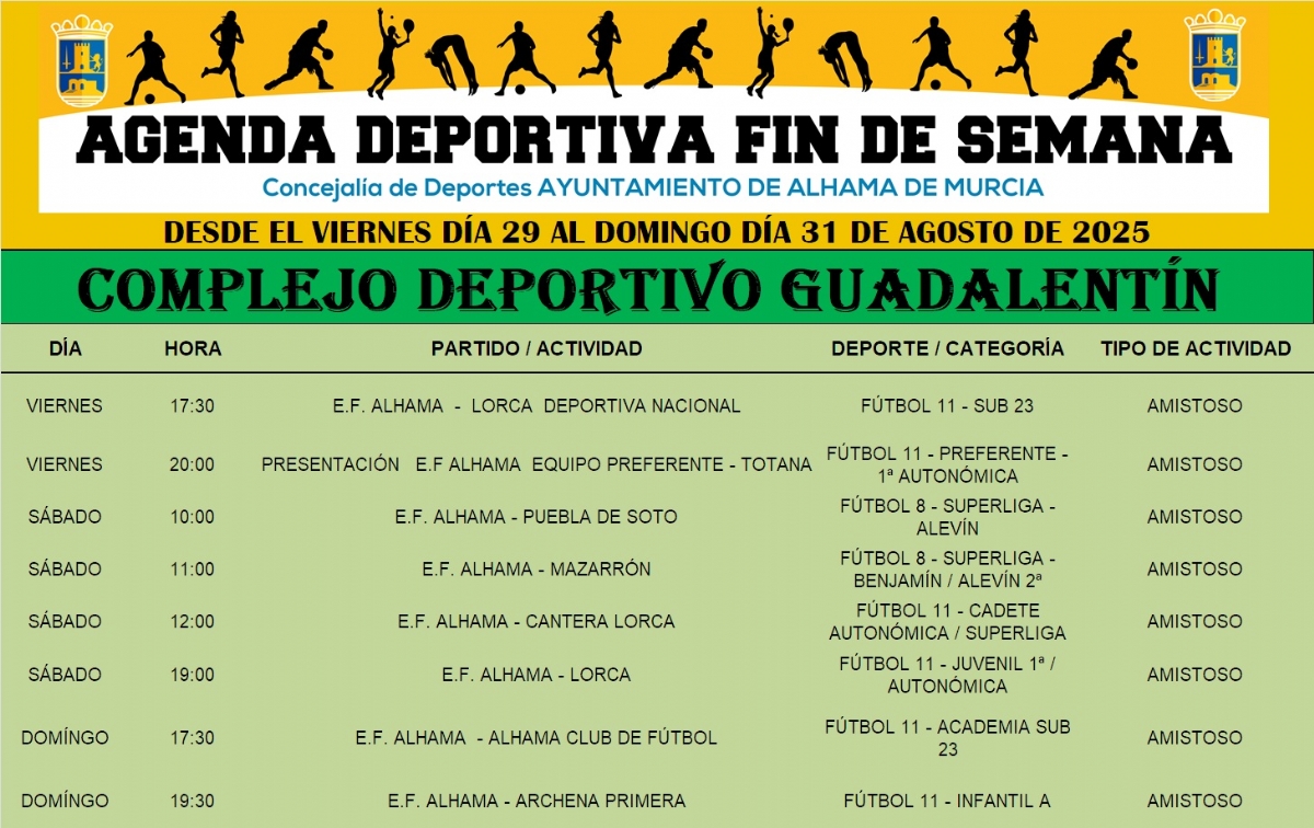 La concejalía de Deportes informa de la actualización de la Agenda Deportiva del viernes 29 hasta el domingo 31 de agosto de 2025.
