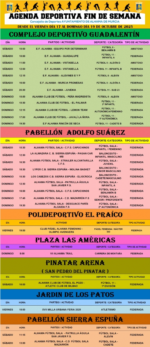 Esta agenda incluye los partidos y eventos deportivos programados en las instalaciones municipales.