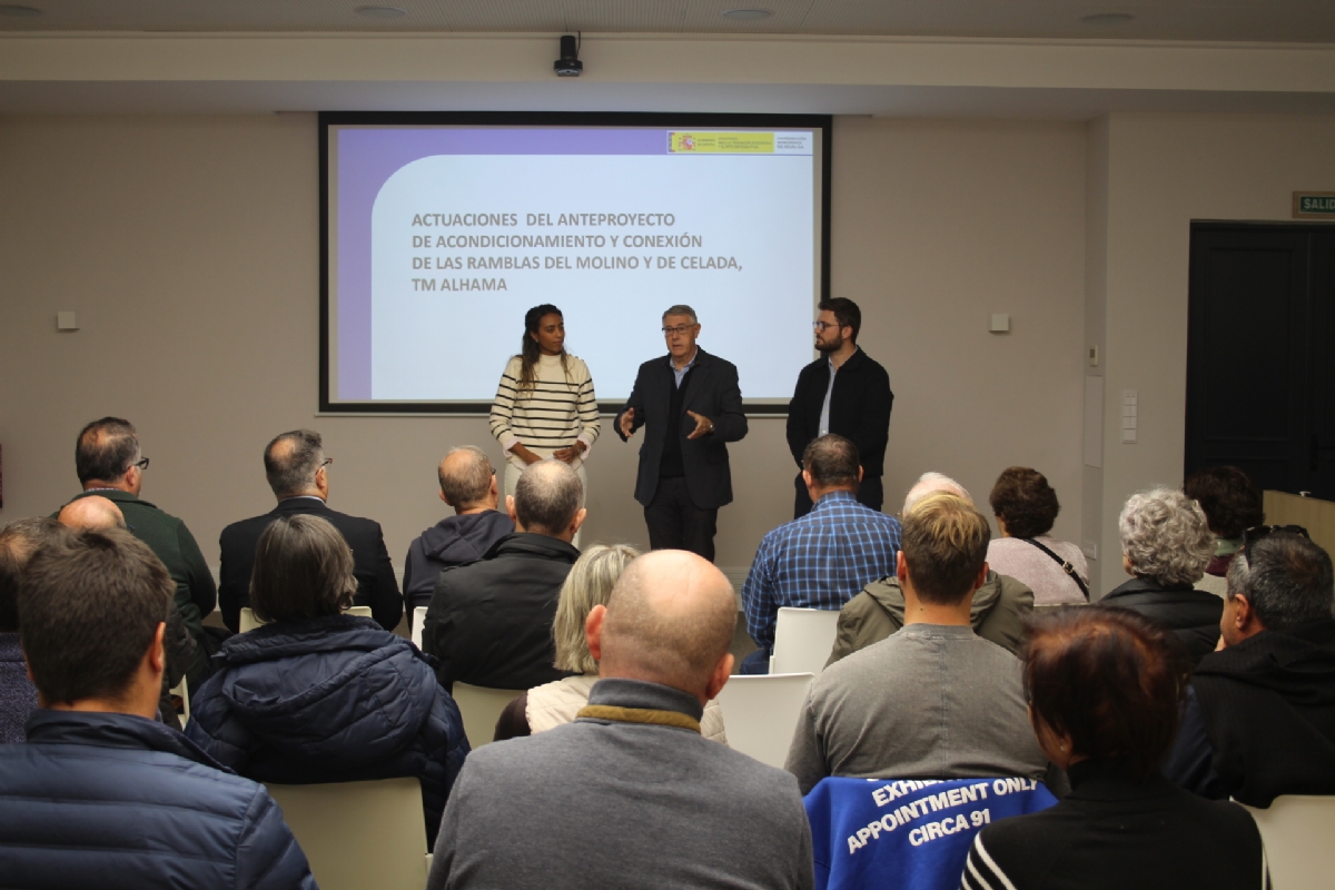 El presidente de la Confederación Hidrográfica del Segura (CHS), Mario Urrea, junto al director técnico, Carlos Marco, y la alcaldesa de Alhama de Murcia, Rosa Sánchez, y concejales del consistorio, han presentado hoy en el salón de plenos del Ayuntamiento las actuaciones contempladas para el acondicionamiento y conexión de las ramblas del Molino y Celada que atraviesan gran parte del municipio y de localidad.