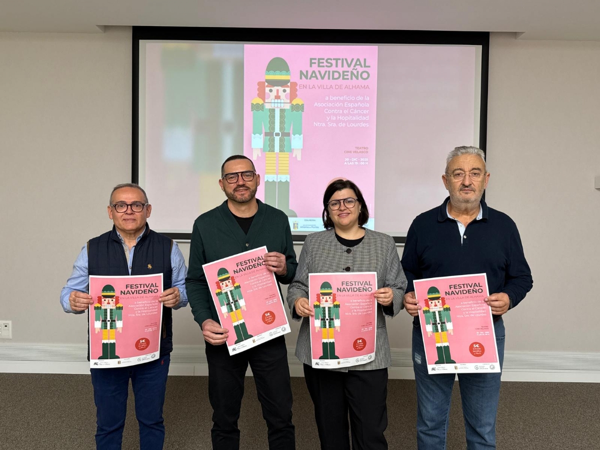 La concejala de Cultura y Patrimonio, Alicia Martínez, ha presentado esta mañana el Festival Navideño Benéfico organizado por el Grupo Folklórico Villa de Alhama, junto a su presidente, Blas Pérez, el miembro del grupo y autor del cartel, José Aledo y el presidente de la Junta Local de la Asociación Española contra el Cáncer (AECC), Pedro Ramón Martínez.
