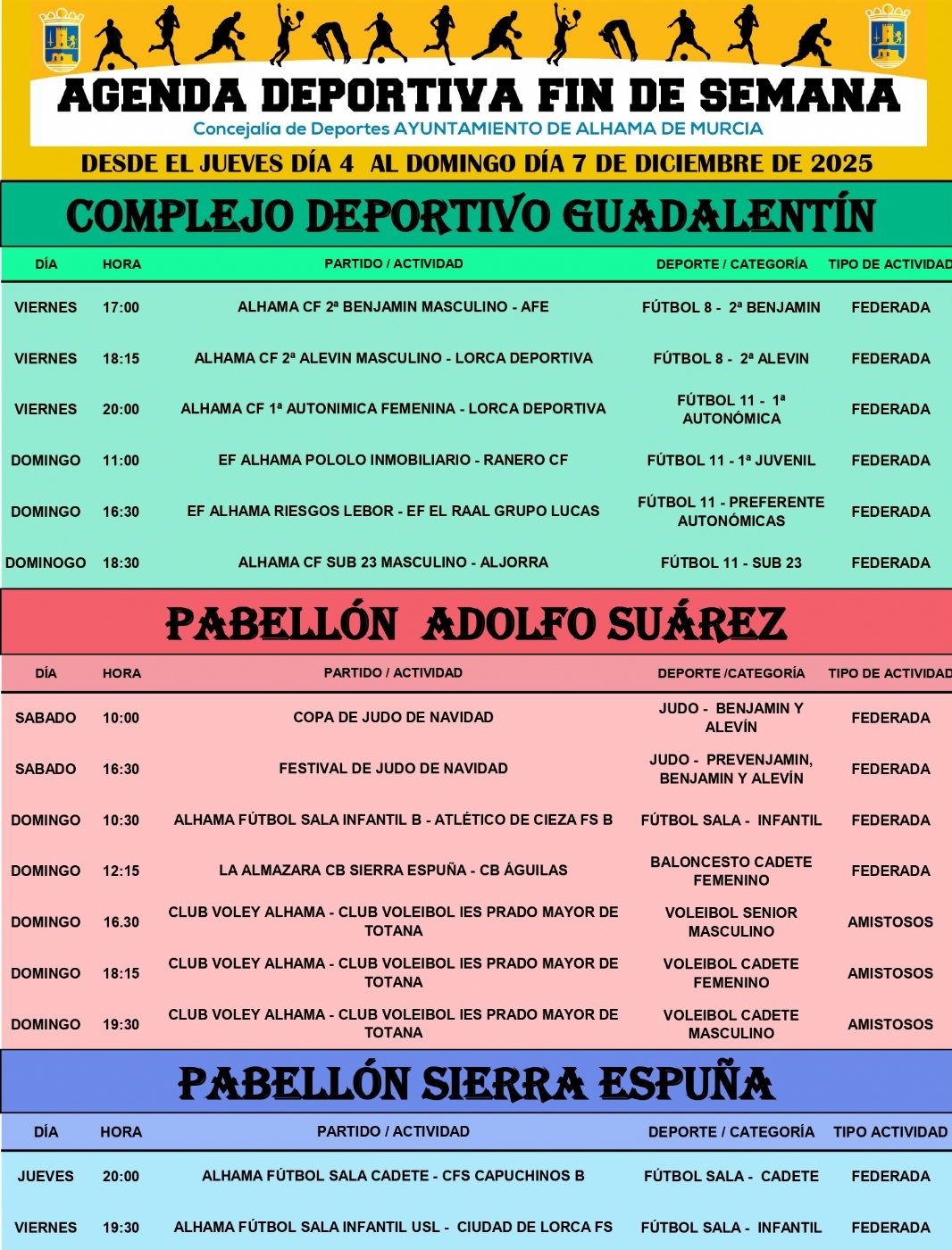 La concejalía de Deportes informa de la actualización de la Agenda Deportiva desde el jueves día 4 al domingo día 7 de diciembre de 2025.