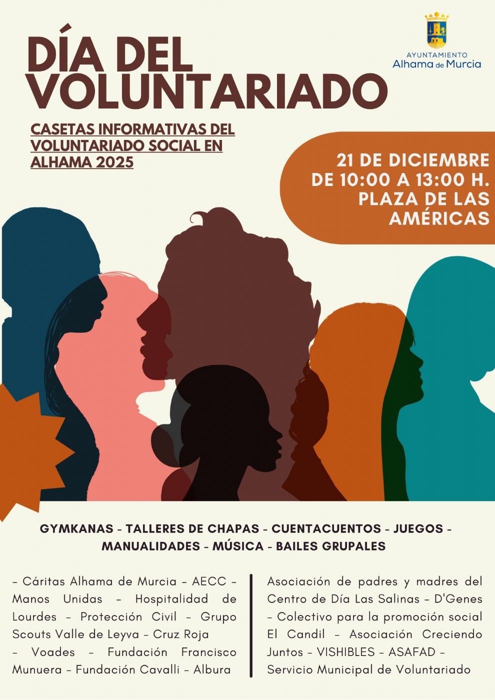 La celebración del Día del Voluntariado tendrá lugar el domingo 21 de diciembre, de 10:00 a 13:00 horas, en la Plaza de las Américas. Será un encuentro abierto a todas las edades, con actividades, talleres, villancicos, bailes y juegos, en el que cada entidad mostrará su labor y la importancia del compromiso solidario. Al evento asistirán las siguientes asociaciones: Cáritas Alhama de Murcia, AECC, Manos Unidas, Hospitalidad de Lourdes, Protección Civil, Grupo Scouts Valle de Leyva, Cruz Roja, Voades, Fundación Francisco Munuera, Fundación Cavalli, Albura, Asociación de padres y madres del Centro de Día Las Salinas, D'Genes, Colectivo para la promoción social El Candil, Asociación Creciendo Juntos, VISHIBLES, ASAFAD y el Servicio Municipal de Voluntariado.