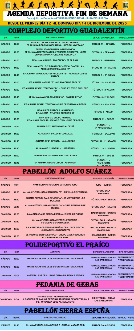 La concejalía de Deportes informa de la actualización de la Agenda Deportiva desde el viernes día 12 al domingo día 14 de diciembre de 2025.