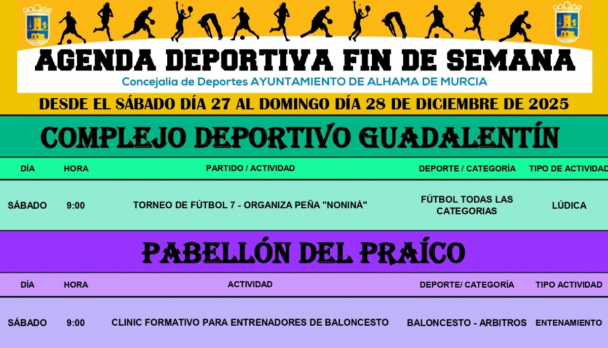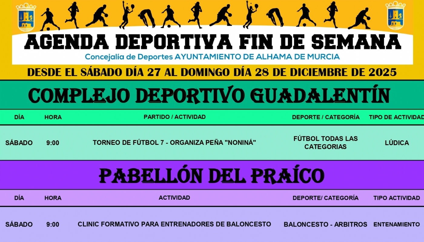 La concejalía de Deportes informa de la actualización de la Agenda Deportiva desde el viernes día 19 al domingo día 21 de diciembre de 2025.