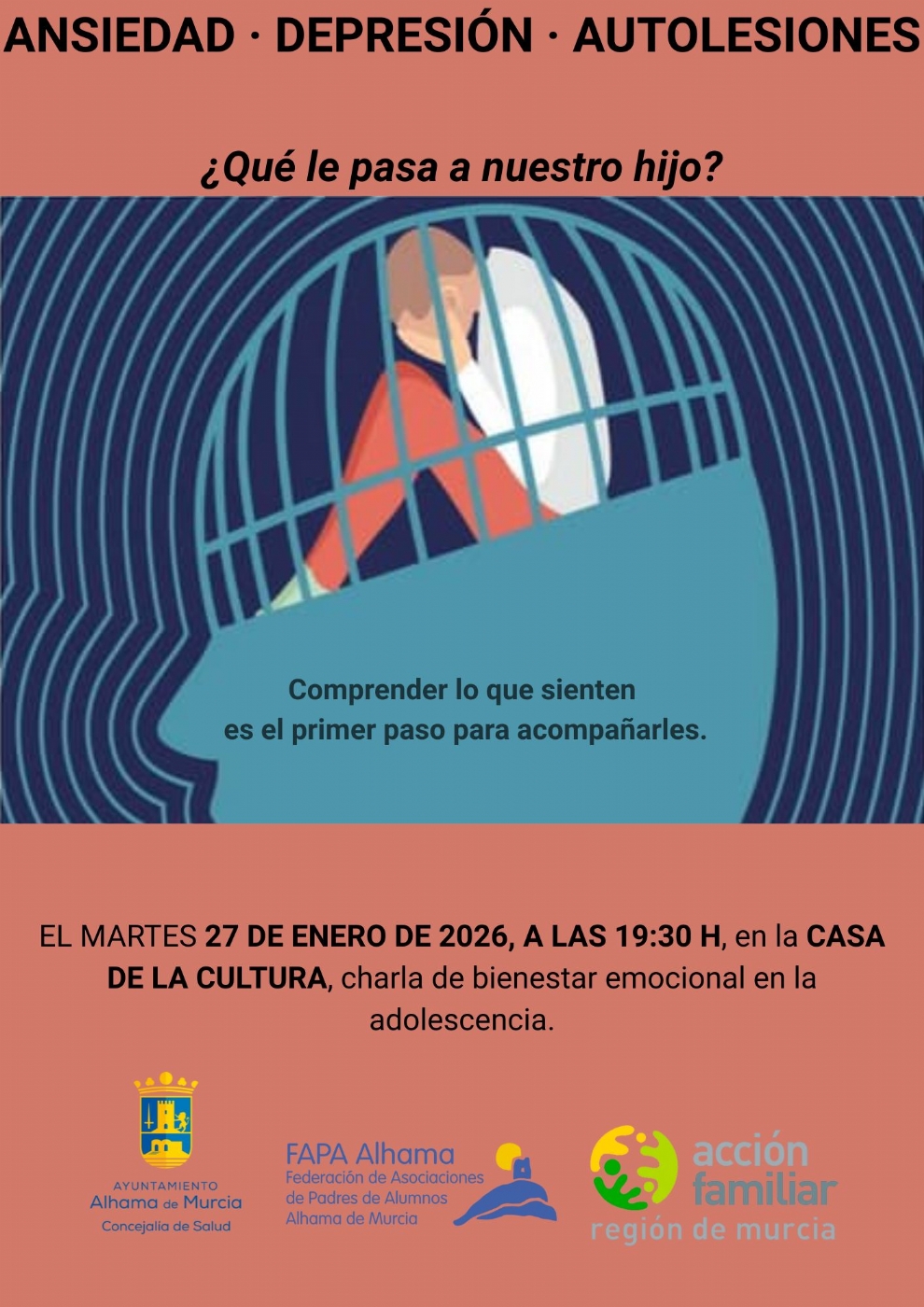 Las concejalías de Salud y Educación organizan una charla informativa centrada en el bienestar emocional de niños y adolescentes, que se celebrará el martes 27 de enero, a las 19:30 horas, en la Casa de la Cultura.