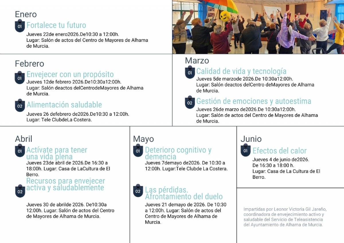 Las actividades se impartirán en distintos espacios municipales, como el Centro de Mayores de Alhama de Murcia, la Casa de la Cultura de El Berro y el Tele Club de La Costera, con el fin de acercar esta propuesta a diferentes zonas del municipio y facilitar la asistencia de la ciudadanía.
