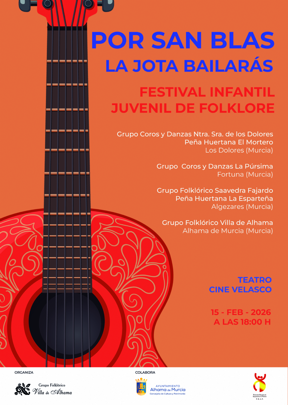 La concejala de Cultura, Alicia Martínez, junto a los miembros de la directiva del Grupo Folklórico Villa de Alhama, José Aledo y su presidente, Blas Pérez, ha presentado el cartel del Festival Infantil y Juvenil de Folklore “Por San Blas, la jota bailarás”, que tendrá lugar el 15 de febrero de 2026, a las 18:00 horas, en el Teatro Cine Velasco.