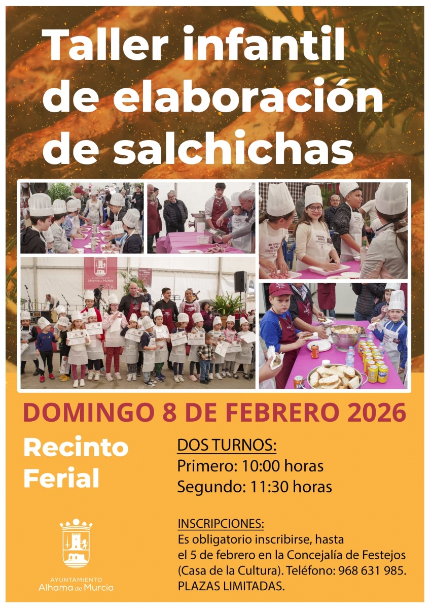 Destacar que el domingo 8 de febrero se realizará un Taller infantil de elaboración de salchichas en el Recinto Ferial mediante dos turnos, el primero a las 10:00 horas y el segundo a las 11:30 horas. Es obligatorio inscribirse, hasta el 5 de febrero en la concejalía de Festejos (Casa de la Cultura). Teléfono: 968 631 985. Las plazas son limitadas.
