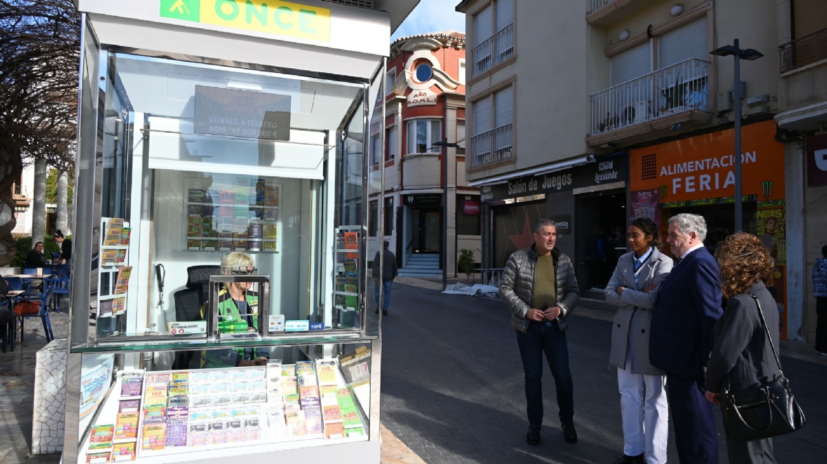 El delegado territorial de la ONCE en la Región de Murcia, Juan Carlos Morejón, y la alcaldesa de Alhama de Murcia, Rosa Sánchez, acompañados por el equipo técnico y miembros del equipo de Gobierno, han inaugurado el nuevo quiosco de la organización en el municipio, una infraestructura concebida para mejorar la accesibilidad, la sostenibilidad y las condiciones de trabajo de los vendedores.
