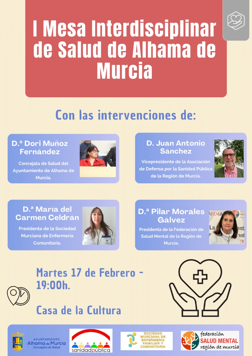 El Ayuntamiento de Alhama de Murcia, a través de la Concejalía de Salud, ha anunciado la celebración de la primera Mesa Interdisciplinar de Salud del municipio, que tendrá lugar el martes 17 de febrero, a las 19:00 horas, en la Casa de la Cultura, con el objetivo de analizar la situación del sistema sanitario regional y los principales problemas de salud que afectan a la población.