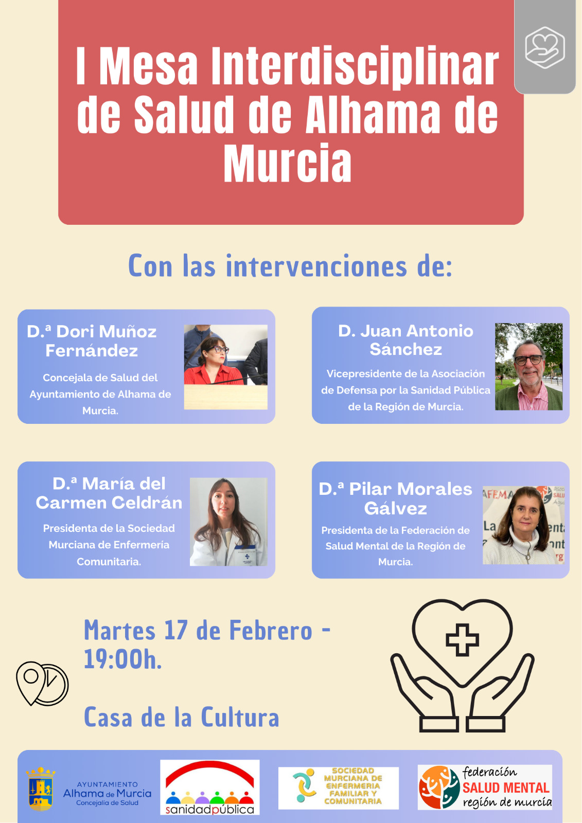 La mesa contará con la participación de Juan Antonio Sánchez, vicepresidente de la Asociación por la Defensa de la Sanidad Pública; María del Carmen Cerdán, presidenta de la Asociación Murciana de Enfermería Comunitaria; Pilar Morales, presidenta de la Federación de Salud Mental de la Región de Murcia; y la propia concejala de Salud del Ayuntamiento.