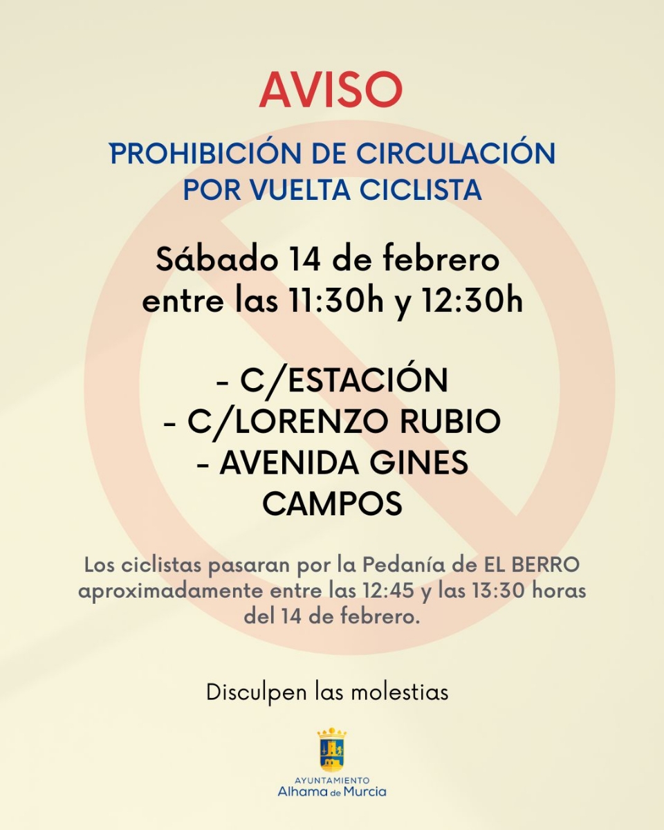 Con motivo del desarrollo de la carrera, el 14 de febrero se establecerá la prohibición de circulación de vehículos entre las 11:30 y las 12:30 horas aproximadamente en las siguientes vías: