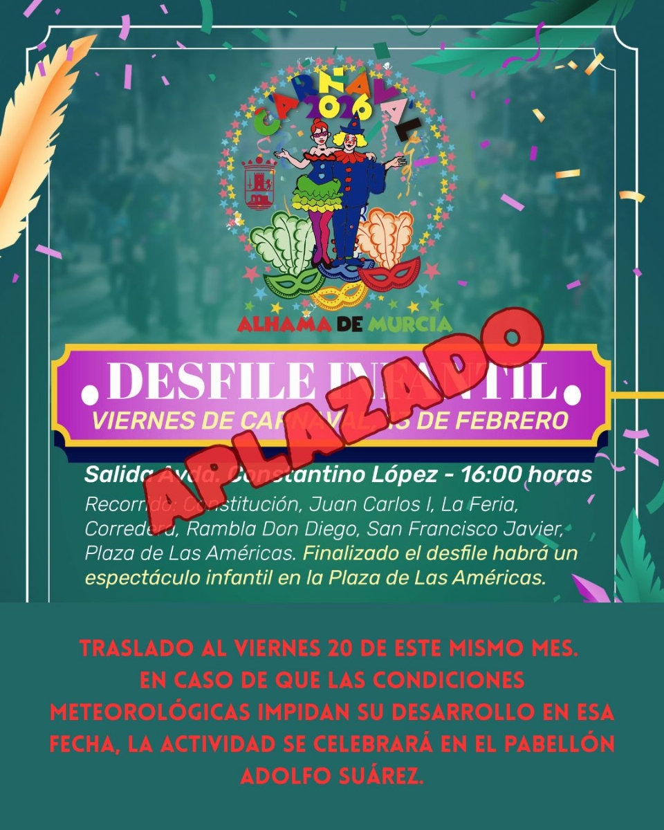 Aplazamiento del Carnaval Infantil programado para el viernes 13 de febrero, que se traslada al viernes 20 de este mismo mes. En caso de que las condiciones meteorológicas impidan su desarrollo en esa fecha, la actividad se celebrará en el pabellón Adolfo Suárez.