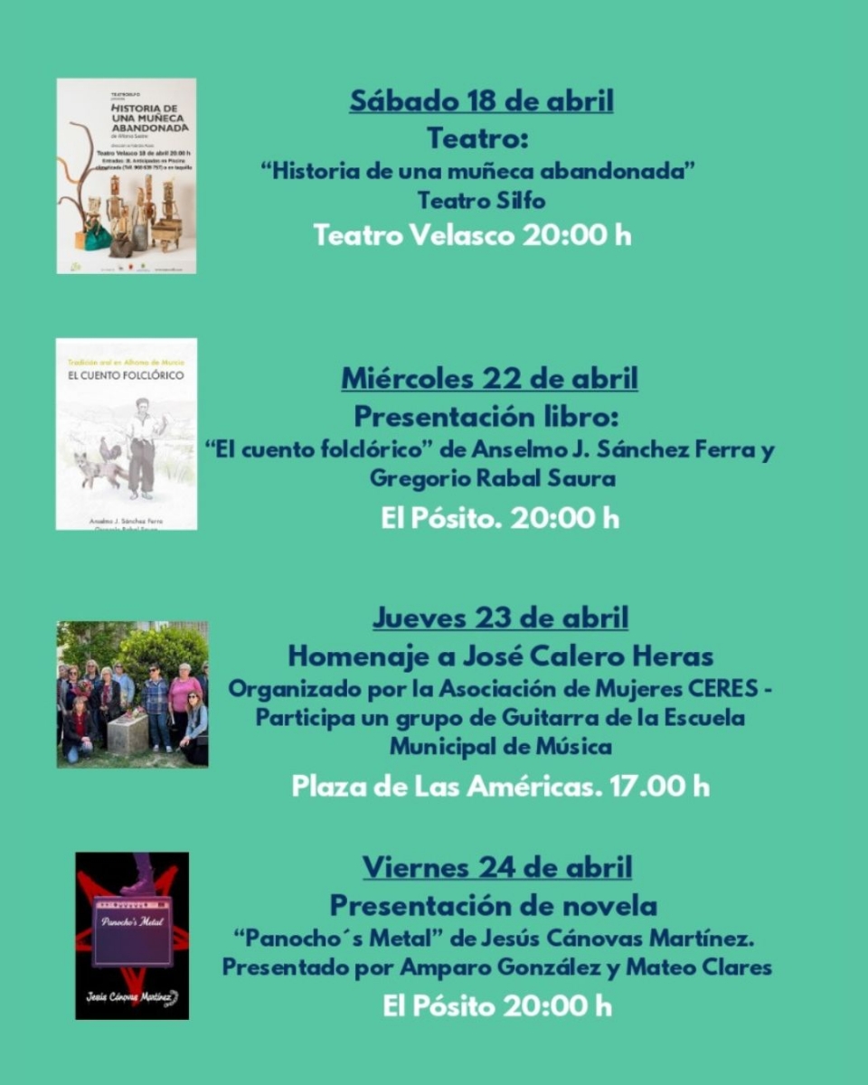 El programa arranca con actividades infantiles como el “Cuento-Aventura” en la biblioteca municipal y continúa con presentaciones de obras como “Museo de lluvias”, “El cuento folclórico” o “Panocho’s Metal”, junto a encuentros literarios con autores.